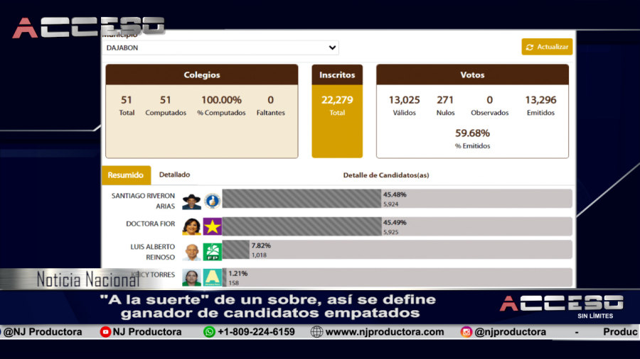 Este domingo 18 de febrero en el país se celebraron elecciones municipales, en las cuales se escogieron los alcaldes, regidores, directores municipales y vocales. En la mayoría de las demarcaciones el ganador ya está definido, no sucede lo mismo con zonas en las cuales se batalla por hasta un voto para definir el triunfador.En el caso de la provincia Dajabón, la Junta Central Electoral (JCE) está contando los votos nulos para precisar el vencedor de la alcaldía de esa demarcación ante el casi empate entre el actual alcalde Santiago Riverón Arias y su contrincante, la doctora Fior. A ambos lo separa solo un voto.De acuerdo a la Ley 20-23 del Régimen Electoral, en su artículo 299, denominado "Resolución de empate", cuando esto ocurre se resolverá el empate "por la suerte" del modo siguiente.Primero, se inscribirán en tarjetas distintas los nombres de los candidatos empatados.Luego, el presidente de la junta electoral correspondiente (de la demarcación) colocará las tarjetas dentro de sobres blancos distintos, los cuales serán cerrados."Tanto los sobres como las tarjetas serán de clase, forma y aspectos iguales", establece el punto 2 del referido artículo.Otro punto que destaca es que este proceso se hará en presencia de los miembros del órgano comicial y de los representantes de partidos, agrupaciones o movimientos políticos que hubieren sustentado candidaturas, pero no del secretario.El punto tres establece que luego el presidente colocará los sobres, "así dispuestos" dentro de un receptáculo y cada uno de los vocales de la junta, sucesivamente, a la vista del presidente, pero no de los demás vocales, revolverá dichos sobres dentro del receptáculo."En seguida, el secretario, en presencia de la junta, sacará un sobre, y el nombre que éste contenga, y que será leído de inmediato en alta voz por el presidente de la junta, será el candidato elegido", indica el punto cuatro del artículo 299 de la Ley 20-23.