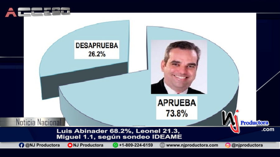 Una nueva encuesta realizada del 14 al 19 del presente mes en la República Dominicana por el Instituto Dominicano de Estudios Aplicados, Mercadeo y Encuesta (IDEAME) sitúa al actual presidente y candidato a la reelección Luis Abinader (PRM) como favorito para ganar con un 68.2% las elecciones nacionales del próximo 19 de mayo.Le siguen Leonel Fernández (FP) con 21.3%, Abel Martínez (PLD) 7.3%, Miguel Vargas (PRD) 1.1%, Roque Espaillat (Partido Esperanza Democrática) 0.8%, Virginia Antares (Opción Democrática) 0.5%, Carlos Peña (Generación de Servidores) 0.4%, María Teresa Cabrera (Frente Amplio) 0.3% y Fulgencio Severino (Partido Patria Para Todos) 0.1.El trabajo de campo de esta encuesta fue realizado durante seis días entrevistando a personas de uno y otro sexo mayores de 18 años, en 6,000 lugares diferentes, con un error muestral de más o menos un 1.8% y un nivel de seguridad de 95.0%.Respecto a la gestión de gobierno que encabeza el presidente Abinader, 73.8% dijo que la aprueba y 26.2% la desaprueba.En cuanto a los partidos que terciarán en los comicios, la encuesta arrojó las siguientes preferencias: PRM 53.4%, FP 18.6%, PLD 15.4%, PRD 1.1%, PRSC 0.8%, Alianza País 0.6% y no sabe 10.1%