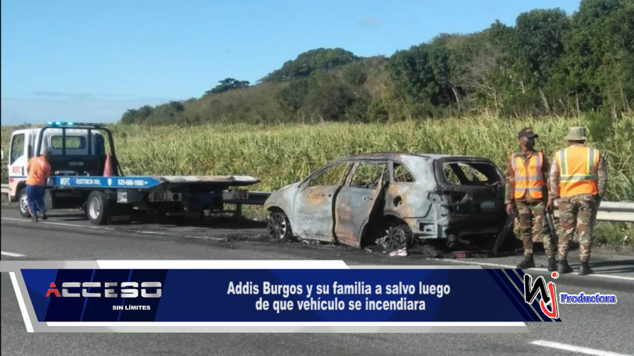 La periodista Addis Burgos y su familia salvaron la vida milagrosamente, luego de que su vehículo resultara totalmente quemado en un accidente en la carretera San Cristóbal-Baní.