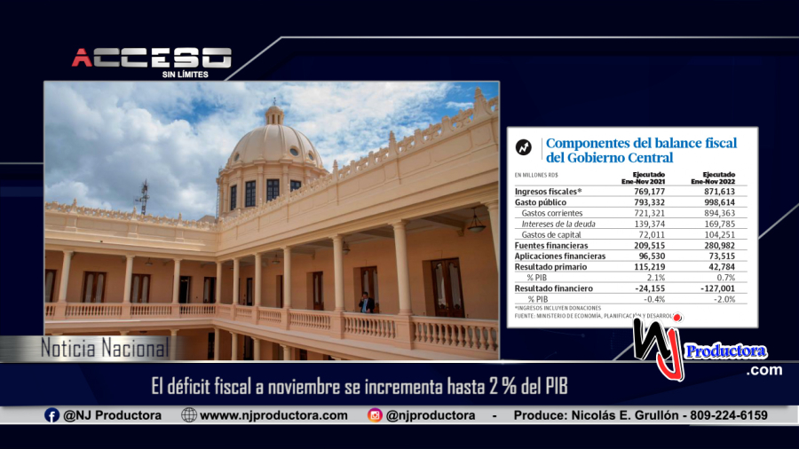 El déficit fiscal del Gobierno Central se situó en 2.0 % del producto interno bruto (PIB) entre enero-noviembre del presente año, para un incremento de 1.6 puntos porcentuales respecto al mismo periodo del 2021.