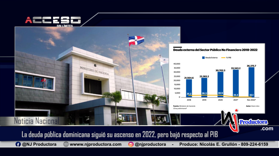 La deuda pública de la República Dominicana cerró el 2022 representando el 59.1 % del producto interno bruto (PIB), un porcentaje menor que el 61.0 % registrado en agosto de 2020, informó ayer el ministro de Hacienda, José Manuel (Jochi) Vicente.