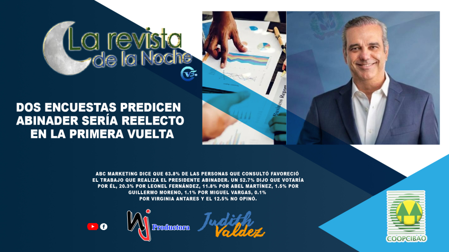 ABC Marketing dice que 63.8% de las personas que consultó favoreció el trabajo que realiza el presidente Abinader. Un 52.7% dijo que votaría por él, 20.3% por Leonel Fernández, 11.8% por Abel Martínez, 1.5% por Guillermo Moreno, 1.1% por Miguel Vargas, 0.1% por Virginia Antares y el 12.5% no opinó.
