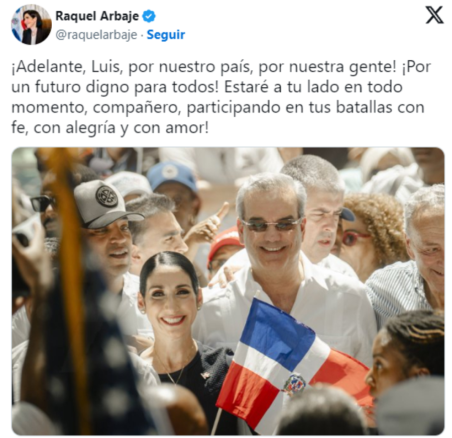 La primera Dama de la República, Raquel Arbaje, a través de su cuenta de Twitter envió un mensaje al presidente Luis Abinader, a propósito de anunciar que se reelegirá en las elecciones presidenciales del 2024.“¡Adelante, Luis, por nuestro país, ¡por nuestra gente! ¡Por un futuro digno para todos! Estaré a tu lado en todo momento, compañero, participando en tus batallas con fe, ¡con alegría y con amor!”,También, los funcionarios de Gobierno del PRM colgaron mensajes en Twitter, utilizando los hashtags #LuisSigue, #Luis4mas, Luis Abinader, Seguimos Avanzando, #Reelección. Frases que rápidamente se hicieron tendencia.“Por un mejor futuro para todos… #LuisSigue #Luis4más”, dice un tuit de José Paliza, presidente del Partido Revolucionario Moderno (PRM) y ministro Administrativo de la Presidencia.