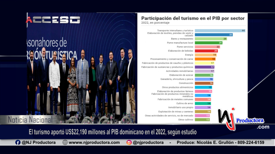 Solo en el 2022, el sector turismo agregó valor por 22,190 millones de dólares al producto interno bruto (PIB) dominicano, representando alrededor del 19 %, con una capacidad de multiplicarse hasta tres veces en la economía.Así lo reveló el estudio "Impacto del sector turismo en la economía dominicana", realizado por la firma Analytica y la Asociación de Hoteles y Turismo de la República Dominicana (Asonahores). El análisis busca dimensionar el impacto directo, indirecto e inducido de la actividad turística en el país.Ayer, durante la presentación del estudio en el sexto Foro de Inversión Turística de Asonahores, la viceministra técnica de Turismo, Jacqueline Mora, subrayó que el 50 % de este valor agregado (11,171 millones de dólares) fue generado de manera inducida, a través del consumo de los empleados del sector turístico.En tanto, el 35 % fue generado de manera directa con la venta de bienes y servicios en el sector, equivalente a 7,692 millones de dólares, mientras que 3,327 millones de dólares se generaron de manera indirecta a través de las compras que generó a otros sectores, para el 15 %."Uno de cada cinco pesos de valor que genera el turismo está vinculado a la economía", enfatizó Mora, fundadora de la firma Analytica.Mora, quien es economista, destacó que el impacto de la industria en el PIB dominicano se distribuye: 17 % en los hoteles, 11 % en el sector construcción, 10 % en las pymes de servicios y el 10 % en el transporte interurbano y turístico.Sin embargo, al tomar en cuenta la participación del turismo en la generación de valor de otros sectores de la economía, esta industria aporta el 44 % del PIB en transporte interurbano y turístico, el 33 % del PIB de la elaboración de productos textiles, de vestir y de calzado, y el 28 % del PIB de los bares y restaurantes, siendo estos los tres sectores más impactados.De igual manera, el turismo cuenta con una participación importante en el sector de las pymes, al aportar el 24 % de aquellas destinadas a la manufactura local y el 22 % de las que ofrecen servicios.Los aportes del turismo al PIB se explican en un 78 % por el flujo de los visitantes que eligen este destino de inversión, mientras que el 22 % proviene de la inversión focalizada en este sector, según el análisis.Además, los hoteles son responsables de haber generado el 59 % de ese valor agregado durante 2022, mientras que el 41 % se distribuye en el resto del sector. En tanto, las operaciones de la banca contribuyeron en un 8 % a esta generación.Por ese motivo, Mora sostuvo que el crecimiento del sector turismo se traduce en el crecimiento de los ingresos fiscales, así como de todos los sectores financieros como la banca y el mercado de valores."Que crezca el sector turismo es una transformación de la economía completa. Y es un sector que, por su naturaleza, tiene la mayor capacidad de absorber el capital humano que tenemos hoy en día", manifestó.