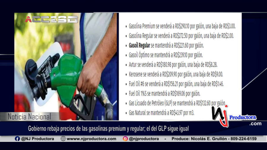 El gobierno dispone rebajas de dos hasta nueve pesos en el precio de cinco de los combustibles que se utilizan en el país, entre ellos la gasolina premium y regular, debido a que los derivados del petróleo comenzaron a ceder en el entorno internacional.La información la compartió hoy el viceministro de Comercio Interno, Ramón Pérez Fermín, destacando que el subsidio permanecerá para el precio del gasoil óptimo y regular, mientras que otros combustibles mantienen sus precios."Desde hace unas semanas, el mercado internacional de los derivados de petróleo ha empezado a ceder con respecto a los altos valores que ha exhibido durante prácticamente todo este 2023. Sin dudas, buenas noticias para las economías que, como la nuestra, dependen al 100 % de las fluctuaciones internacionales de los mercados energéticos", explicó el viceministro."Con gran alegría y júbilo podemos anunciar para esta semana, la antepenúltima de este año, reducciones en las gasolinas, tanto la premium como la regular, al tiempo que se mantendrán sin variación los demás combustibles", dijo Pérez Fermín.• Gasolina Premium se venderá a RD$290.10 por galón, una baja de RD$3.00.• Gasolina Regular se venderá a RD$272.50 por galón, una baja de RD$2.00.• Gasoil Regular se mantendrá a RD$221.60 por galón.• Gasoil Óptimo se mantendrá a RD$239.10 por galón.• Avtur se venderá a RD$180.98 por galón, una baja de RD$8.28.• Kerosene se venderá a RD$209.90 por galón, una baja de RD$9.00.• Fuel Oíl #6 se venderá a RD$156.21 por galón, una baja de RD$1.46.• Fuel Oíl 1%S se mantendrá a RD$169.06 por galón.• Gas Licuado de Petróleo (GLP) se mantendrá a RD$132.60 por galón.• Gas Natural se mantendrá a RD$43.97 por m3.