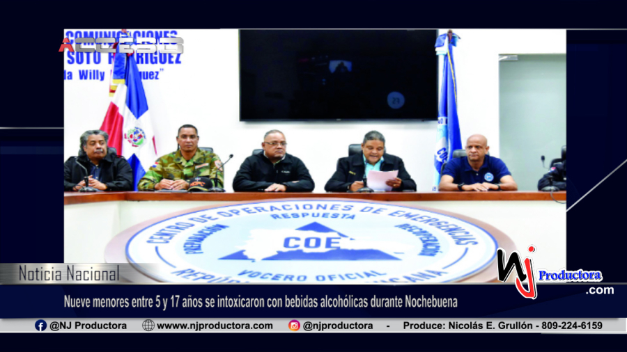 Durante Nochebuena se registraron 163 intoxicaciones por ingesta de bebidas alcohólicas, de las cuales nueve fueron casos de menores de edad.En el más reciente boletín del Centro de Operaciones de Emergencia (COE), se dio a conocer que los menores involucrados tienen entre cinco y 17 años de edad.El informe detalla que las intoxicaciones ocurrieron en provincias como Puerto Plata, Santo Domingo, Duarte y San Cristóbal.“El Servicio Nacional de Salud se mantiene activo para garantizar la asistencia a la población”, afirmó el general retirado Juan Manuel Méndez, director del COE.Según refirió el COE, el Servicio Nacional de Salud (SNS) informó que en los hospitales de la red pública, en función de las variables del operativo, se atendieron 907 personas, además 283 fueron atendidas por otras causas para un total de 1,190 atenciones en salud.El COE también reportó que un total de nueve personas fallecieron en accidentes de tránsito durante el asueto de Nochebuena.Según su informe, en seis de las nueve muertes se habrían visto involucradas motocicletas y solo dos del total de personas estaban dentro del dispositivo de seguridad instalado mediante el operativo “Conciencia por la Vida, Navidad 2023”.Dos de los fallecidos fueron en vehículos livianos y un último por atropellamiento, todos de nacionalidad dominicana y mayores de edad. ¡Compártelo con tus amigos!Nj productoraMarcamos la pauta a seguirEsta dirección de correo electrónico está siendo protegida contra los robots de spam. Necesita tener JavaScript habilitado para poder verlo.809-224-6159 cel.