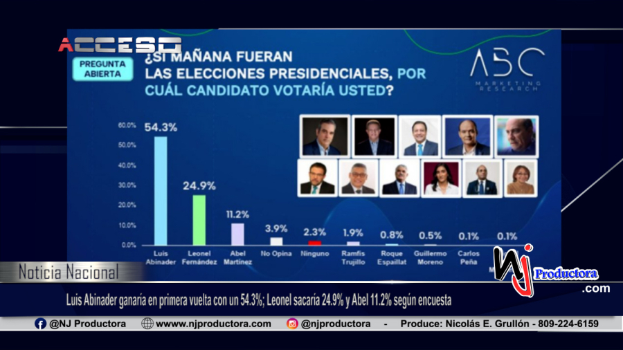 La quinta encuesta nacional de percepción social y política de la firma peruana ABC Marketing presentada este martes, asegura que el presidente Luis Abinader, candidato del Partido Revolucionario Moderno (PRM), obtendría un 54.3% de la preferencia electoral, mientras que Leonel Fernández, del Partido Fuerza del Pueblo (FP), alcanzaría un 24.9% y Abel Martínez, candidato del Partido de la Liberación Dominicana (PLD), lograría un 11.2%. En un eventual escenario de segunda vuelta, Abinader ganaría también cómodamente.