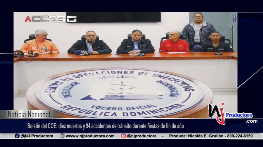 El Centro de Operaciones de Emergencia (COE) reportó que diez personas fallecieron en los 94 accidentes de tránsito registrados este fin de semana, que coincidió con la festividad de Año Nuevo. Los datos están contenidos en los boletines número uno y dos de la segunda fase del Operativo de Navidad "Conciencia Por la Vida". En el primer boletín, el organismo manifestó que tres personas murieron y otras 40 resultaron afectadas en los 35 accidentes de tránsito registrados el sábado 30 de diciembre.De los 35 accidentes registrados, 30 involucraron motocicletas, un vehículo liviano y hubo cuatro atropellamientos.En tanto que el lunes el titular del organismo, Juan Manuel Méndez, al leer el segundo boletín, informó que siete personas fallecieron en 59 accidentes de tránsito registrados el domingo 31 de diciembre. De los 59 accidentes, ocurridos desde las 6:00 de la mañana del 31 de diciembre a las 6:00 de la mañana del 1 de enero, 47 involucraron motocicletas, cinco vehículos livianos, cinco atropellamientos, una bicicleta y un vehículo pesado.De los siete fallecidos "dos ocurrieron dentro del dispositivo de seguridad vial y cinco fuera del mismo." Los muertos fueron cinco por motocicletas y dos por atropellamientos. Los informes agregan que el Ministerio de Obras Públicas, a través de la Comisión Militar y Policial (Comipol), realizó 2,621 asistencias viales las cuales consistieron en: Seguridad Ciudadana, Rescates, Asistencias Médicas, cambios de gomas, combustibles, remolques y asistencias mecánicas entre otras actividades en autopistas, calles y avenidas.El Centro de Operaciones de emergencia reportó en el primer boletín de esta segunda fase que 38 personas resultaron afectadas por intoxicación alcohólica, de las cuales dos resultaron ser menores de 16 años. El informe destaca que se atendieron 11 personas por intoxicación alimentaria. El segundo boletín detalla que se han atendido unas 139 personas intoxicadas por alcohol, de estas seis involucran a menores con edades entre los 13 y 17 años. También se han atendido 41 personas por intoxicación alimentaria. Este reporte señala que las provincias con más casos son Santo Domingo, Santiago, Distrito Nacional, San Cristóbal y Monseñor Nouel.Según los boletines, el Servicio Nacional de Salud informó que, en los hospitales de la red pública, "en función de las variables del operativo, se han atendido 842 personas, además, 286 fueron atendidas por otras causas para un total de 1,128 atenciones en salud". La Defensa Civil sostuvo que brindó quince asistencias en salud, al tiempo que informó que se mantienen instalados dos hospitales de campaña y se realizaron señales de reducción de velocidad y uso del cinturón de seguridad.