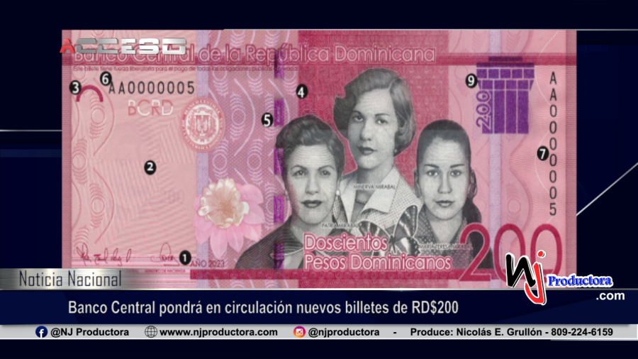 El Banco Central de la República Dominicana (BCRD) informó hoy que, a partir del lunes 8 de enero de este 2024, circularán los billetes de 200 pesos dominicanos, año 2023. "Estos billetes, cuya fabricación se ordenó mediante licitación pública internacional en mayo de 2023, contienen las mismas características de seguridad de los billetes de 200 pesos dominicanos actualmente en circulación, los cuales mantendrán su fuerza liberatoria para el pago de todas las obligaciones públicas y privadas", indica el BCRD en un aviso informativo.1. Año: ubicado en la parte inferior del anverso, permite identificar el año en que se ordenó su fabricación. 2. Marca de agua: imagen del patricio Juan Pablo Duarte, que se hace visible al exponer el billete al trasluz, acompañado a la derecha del valor de la denominación "200" de forma horizontal.3. Marcas para los no videntes: figura geométrica en alto relieve ubicada en el borde del extremo izquierdo superior. 4. Imagen latente: pequeñas líneas invertidas que conforman un grabado con las iniciales "BCRD". Puede observarse en un determinado ángulo, con ayuda de la luz.5. Hilo de seguridad: delgada tira que contiene la denominación del billete y un diseño con cambio de color de magenta a verde combinable con el isotipo. En el anverso se encuentra aventanillado sobre la superficie del papel y en el reverso insertado dentro de la masa del papel.6. Numeración horizontal: número de identificación de cada billete, ubicado del lado izquierdo superior. Esta es igual a la numeración vertical. 7. Numeración vertical: número de identificación de cada billete, ubicado del lado derecho. Esta numeración es igual a la numeración horizontal.8. Microimpresiones: inscripciones en letras muy pequeñas, que a simple vista parecen una línea llena, pero que con la ayuda de una lupa o lente de aumento se pueden apreciar9. Isotipo con la identidad visual del BCRD: acompañado del valor de la denominación en caracteres numéricos, que en conjunto cambian de color de magenta a verde, impreso con tinta ópticamente variable.Los billetes se emiten en virtud de las disposiciones contenidas en los Artículos 228, 229 y 230 de la Constitución de la República Dominicana y del Artículo 25, literales a) y c) de la Ley Monetaria y Financiera 183-02.El Banco Central exhortó a la ciudadanía a que, ante cualquier duda con este u otro billete o moneda, consulte las informaciones disponibles en su página web.