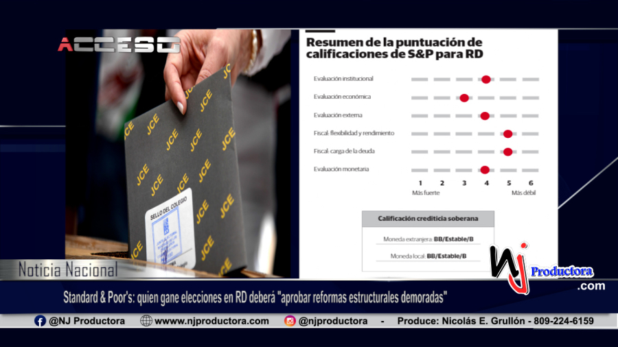 La agencia de calificación de riesgo Standard & Poor's (S&P Global) estima que el partido que gane las elecciones dominicanas de este 2024 enfrentará el desafío de "aprobar reformas estructurales largamente demoradas". La agencia estadounidense señala que diferentes gobiernos del país han enfrentado "consistentemente desafíos" para aprobar e implementar reformas estructurales, como modificaciones al sistema tributario, al sector eléctrico, a las pensiones o al sistema laboral.Observa que el actual gobierno perremeísta -en la administración desde el 16 de agosto del 2020- ha podido aprobar algunas medidas complementarias, pero advierte que aún está por verse si se aprobarán e implementarán reformas más profundas después de las elecciones presidenciales y legislativas de mayo del 2024."Las rigideces presupuestarias y una elevada carga de intereses están pesando sobre la flexibilidad fiscal del gobierno -agrega-; la incapacidad o falta de voluntad para promover medidas de política correctivas podría conducir a perfiles fiscales y de deuda estructuralmente más débiles", indica en el borrador de un reciente informe sobre el país del 3 de enero del 2024.Aunque en el reporte se destaca que la estabilidad macroeconómica seguirá siendo la base de la solvencia crediticia de la nación, que el país sentirá menos presión inflacionaria por la estricta política monetaria y se resalta el buen desempeño del sector turismo, también se advierten necesidades en el corto plazo que pudieran afectar la calificación del país, un año después de que el crecimiento del producto interno bruto (PIB) real fuera menor a lo usual, estimado por la agencia en 2 %."Podríamos bajar las calificaciones durante los próximos 12 a 18 meses si el crecimiento económico pierde impulso por razones estructurales, lo que podría resultar en mayores déficits fiscales y un empeoramiento del perfil externo. También podríamos bajar las calificaciones si los desafíos actuales para aprobar reformas se traducen en déficits fiscales y deuda sustancialmente mayores", se advierte en el reporte.En cambio, se anticipa que la calificación podría subir en ese mismo tiempo si el país demuestra capacidad para aprobar e implementar reformas que mejoren su planificación fiscal y de deuda, lo que se traducirá en menores déficits gubernamentales.El país lleva más de una década con la meta de alcanzar una calificación de grado de inversión, que se obtiene mediante las evaluaciones de las firmas calificadoras. Esta debe ser "BBB" o mayor. Standard & Poor's señala que los mayores ingresos por turismo y las menores importaciones, como resultado de la desaceleración económica del país, han reducido los déficits en cuenta corriente y contenido las presiones sobre el tipo de cambio. "Sin embargo, esperamos que el país siga siendo vulnerable a shocks externos, como oscilaciones en los precios de los hidrocarburos", anticipa.La agencia recuerda que el país se ha comprometido con gastar el 4 % del PIB en educación y el gobierno proporciona consistentemente subsidios al sector eléctrico que equivalen aproximadamente al 1.3 % del PIB, los que están sujetos a los precios globales de los hidrocarburos."Esta rigidez presupuestaria ha llevado al gobierno a mantener déficits moderados mediante la reducción de los gastos de capital. Esto pone de relieve la necesidad de larga data de medidas fiscales para mejorar la eficiencia del gasto, ampliar la base impositiva y reducir las exenciones fiscales", insiste.