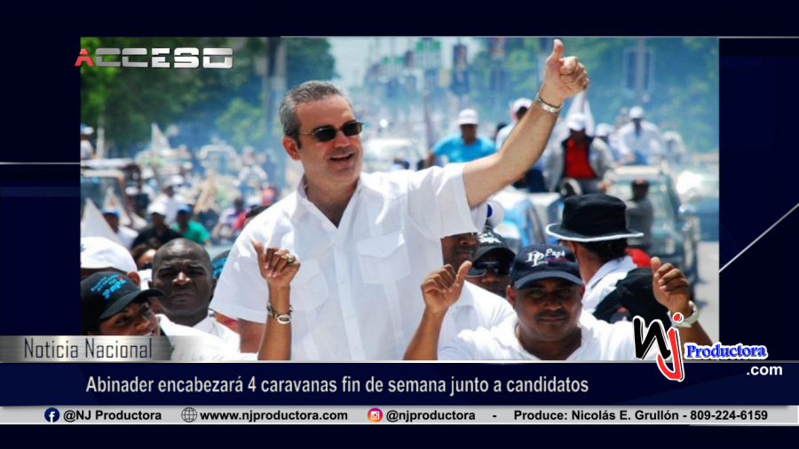 El candidato presidencial del Partido Revolucionario Moderno (PRM) Luis Abinader encabezará este fin de semana cuatro caravanas en apoyo a los candidatos a alcaldes de su partido en una «intensa» agenda política, que incluye la proclamación como candidato presidencial del partido Alianza País. El presidente de la República y «líder» del PRM tiene pautado para este viernes a las 2:00 de la tarde encabezar una caravana en San Juan en apoyo a la candidata a alcaldesa, Hanoi Sánchez, informó el PRM en una nota.Este sábado 13, el presidente Abinader iniciará sus actividades con una caravana en Barahona, junto al candidato a alcalde Mictor Fernández, que partirá a las 9:30 de la mañana desde el sector El Palmarito, en esa ciudad.A las 2:00 de la tarde del sábado, Abinader liderará una caravana en Azua, junto al candidato a alcalde Rafael Hidalgo, que partirá frente a la escuela Ángel Rivera, en la carretera Sánchez.Por otra parte, el domingo próximo a las 10:00 de la mañana en el Pabellón de Voleibol del Centro Olímpico Juan Pablo Duarte, el partido Alianza País proclamará al presidente Abinader candidato presidencial, y a su líder Guillermo Moreno candidato a senador del Distrito Nacional, tras un acuerdo entre ambas organizaciones.Abinader encabezará ese mismo día, a partir de las 2:00 de la tarde, una gran caravana en Santiago junto al candidato a alcalde del PRM y aliados, Ulises Rodríguez.La salida será de la calle Penetración de los Reyes, Esquina Carretera Jacagua, precisó la información.
