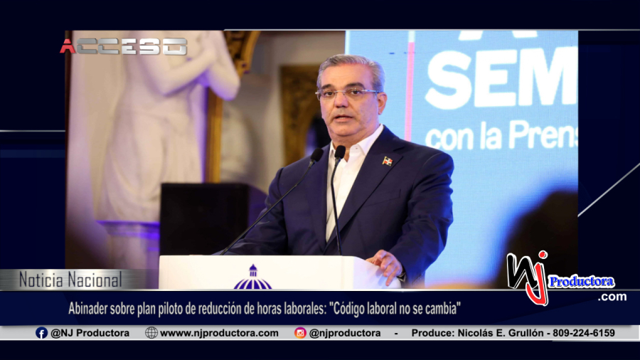 El presidente de la República, Luis Abinader, aseguró que el código laboral dominicano no se cambia ni recibirá ninguna alteración ante el plan piloto que establece una reducción de las horas laborales cada semana. "Ese es un plan piloto donde es bueno dejar claro que el código laboral no se cambia ni va a recibir ninguna alteración", indicó el gobernante durante el desarrollo de LA Semanal con la Prensa, cuando se le cuestionó sobre su parecer respecto a este plan.Aclaró que las empresas fueron las que quisieron hacer este plan piloto para determinar si con menos horas, aumenta su productividad."Sencillamente son compañías que han querido hacer ese plan piloto, para determinar si con menos horas, aumenta su productividad. Eso ha pasado en otros países. Entonces pidieron permiso al ministerio y bueno vamos a ver en que termina ese plan piloto", puntualizó.