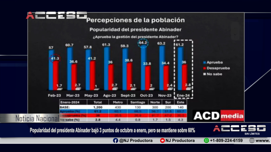 Que el presidente Luis Abinader ha bajado tres puntos porcentuales de popularidad en últimos cuatro meses, es lo que refleja la Encuesta Nacional de Opinión Pública del Grupo ACD-Media, presentada este jueves 18. Y es que, a partir de la medición aplicada a una muestra de 1,200 personas, entre los días 12 y 15 de enero, en octubre del 2023 la popularidad del jefe de Estado se colocaba en 64.2%, sobre 63.2% que obtuvo en noviembre.Los resultados de la encuesta número 10 del grupo de medios que preside el periodista Dany Alcántara, indican que hasta el 15 de enero la popularidad del mandatario, candidato a la reelección, estaba en 61.2%.En mediciones anteriores la popularidad del presidente Luis Abinader marcaba 57% en febrero 2023, menor que en marzo, cuando le favorecía un 60.7%, sobre el 57.8 que obtuvo en mayo del pasado año.Mientras, en agosto, cuando cumplió tres años de mandato, el jefe de Estado marcaba en popularidad 61.3%, sobre el 59.3% que alcanzaba en la encuesta presentada por el Grupo ACD-Media en septiembre.