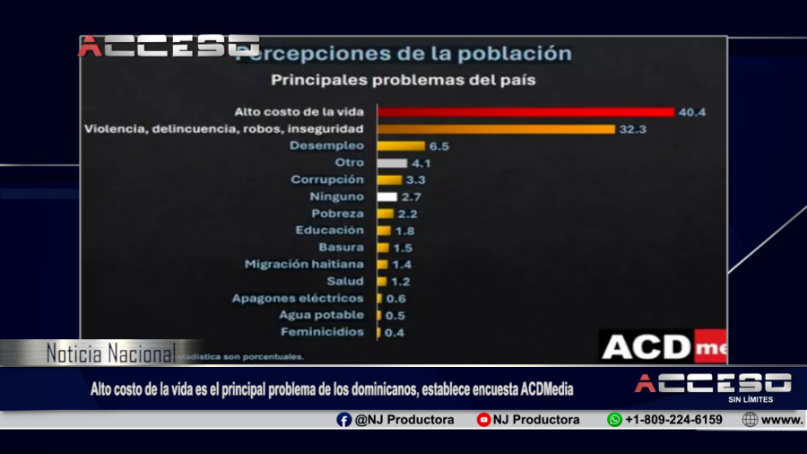El alto costo de la vida es el principal problema que afecta a los dominicanos, revelan los resultados de la décima encuesta de opinión pública del grupo ACDMedia, publicados este jueves. La investigación indica que cuarenta de cada cien dominicanos dicen que los altos precios son el principal problema, mientras un 32.3 por ciento indica que la violencia, la inseguridad, la delincuencia y los robos son el principal problema.En tanto, desempleo ocupa el lugar tres con un 6.5 por ciento y le sigue la corrupción con un 3.3 por ciento.En último lugar figuran la falta de agua potable y los feminicidios con 0.5 por ciento y 0.4 por ciento respectivamente.