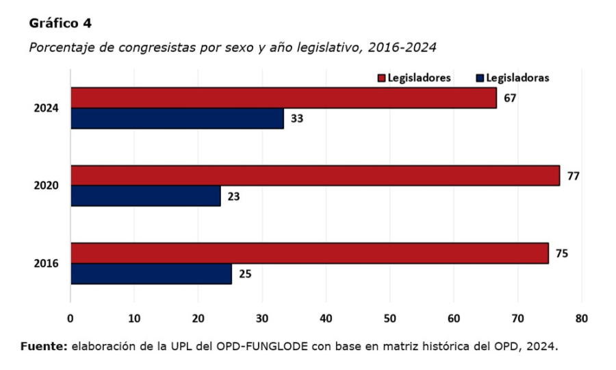Esto quiere decir, que, el 45 % del total de congresistas para 2024 estuvo con anterioridad en algún cargo en las instancias legislativas”, precisa el documento del OPD-FUNGLODE.