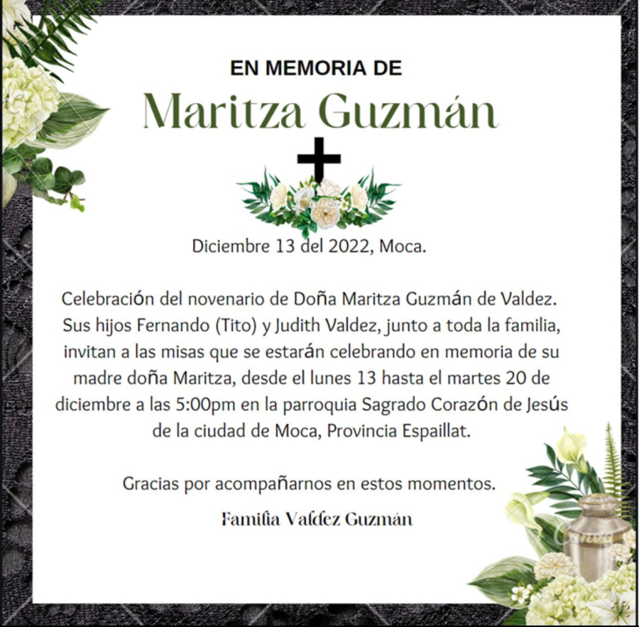 Celebración del novenario de la Sra. Maritza Guzmán de Valdez desde el 13 hasta el 20 de diciembre a las 5p.m., En la parroquia Sagrado Corazón De Jesús, Moca