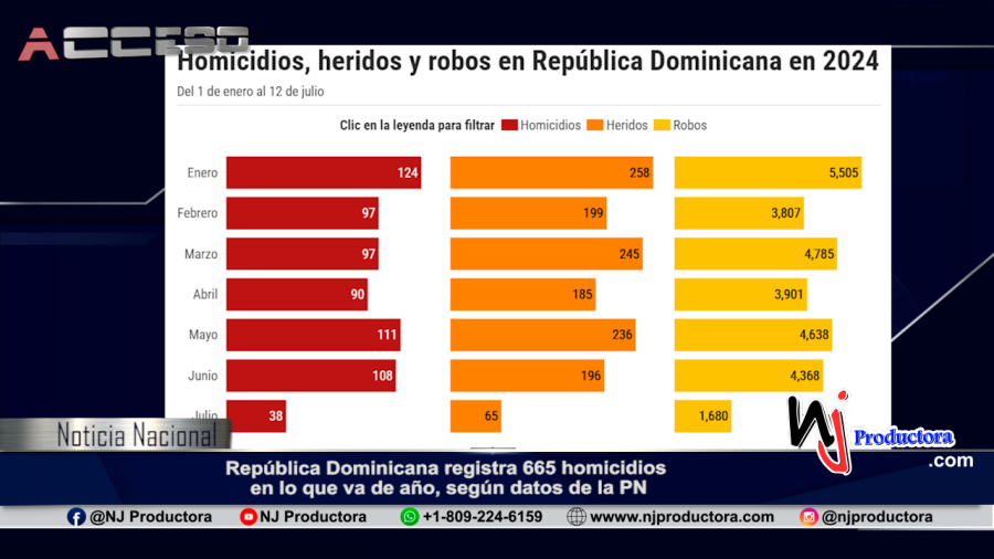 Los informes de la Policía Nacional indican que en lo que va de año han ocurrido 665 homicidios en la República Dominicana. Esta cifra se obtuvo de los reportes publicados mensualmente en sus Análisis Estadísticos de Criminalidad, los cuales detallan que la mayoría de estas muertes han sido producto de riñas. Algunas han ocurrido en medio de acciones delictivas y otras circunstancias.Además, detalla que desde el 1 de enero hasta el 12 de julio, un total de 1,384 personas han resultado heridas.De acuerdo con la institución, durante dicho período ocurrieron 28,684 robos, incluyendo formas simples, atracos, rupturas, arrebatamientos y otros tipos.Los agentes han incautado 1,116 armas de fuego, algunas de las cuales habían sido robadas, otras eran ilegales y otras, aunque legales, estaban en proceso de investigación.De estas armas, incautaron 287 en los primeros 12 días de julio, 269 en junio, 560 en mayo, 425 en abril, 461 en marzo y 321 en febrero. El mes de enero no figura en los reportes.Las autoridades también confiscaron 17,838 armas blancas.Además, en sus reportes notificaron que desde el 1 de febrero hasta el 30 de junio han intervenido en 1,859 "teteos".